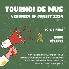 19 h : MUS TXAPELKETA, 100€ irabazteko. Izen emaiteak bertan egiten dira, 10€ pertsonaka. Taloak eta edariak salgai izanen dira.
