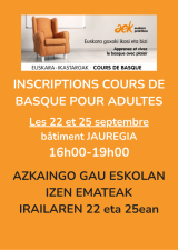 Azkaingo Gau eskolak izena emateko bi hitzordu proposatzen dizkizu irailaren 22 eta 25an, arratsaldeko 16h00ak eta 19h00ak artean, Jauregia egoitzan