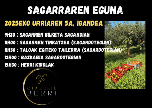 Goizetik hasita, ttikiek eta handiek sagardiko sagar bilketan parte hartzeko aukera izango dute; Saggaren tinkatzea egin eta sagardoa nola egiten den ikasteko aukera izango dute. Goizak taloa egiteko tailer batekin segituko du. Bazkalorduan, sagardotegiko bazkari handi bat zerbitzatuko da, euskal kantuen erritmoan. Arratsaldean, Herri Kirolakin animatuko dira bazterrak, eguna umore onean hesteko. Sagarra ohorezkoa izango den, familia eta besta giroko hitzordu bat izango da .