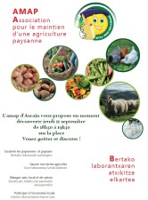 Azkaingo AMAP Bertako Laborantxaren Mantentzeko Elkarteak, deskubritze hitzordu bat proposatzen dizue irailaren 11an, arratseko 6:30etatik 7:30ak arte, herriko plazan.