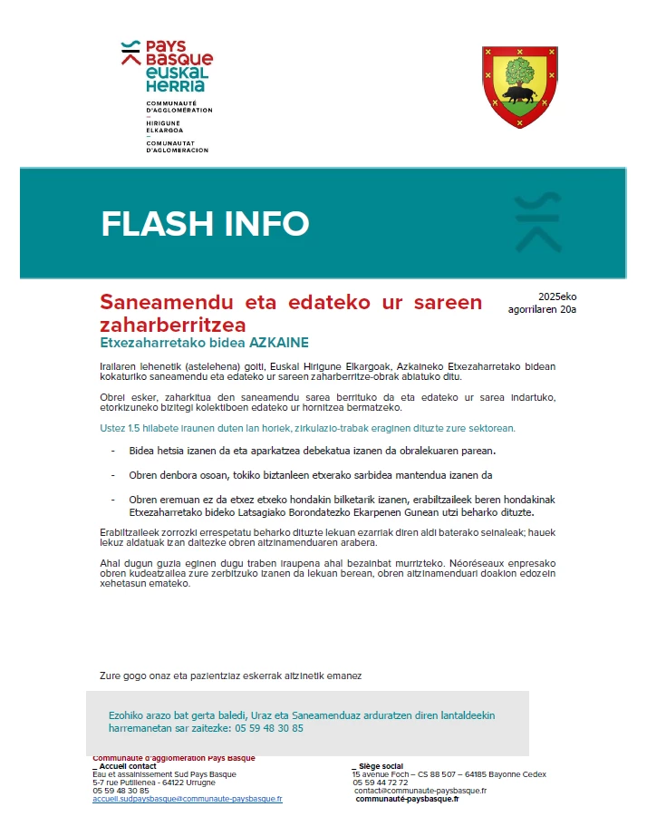 Arazorik baldin bada, sartu harremanetan Ur eta Saneamendu taldearekin 05.59.48.30.85 telefonoan.