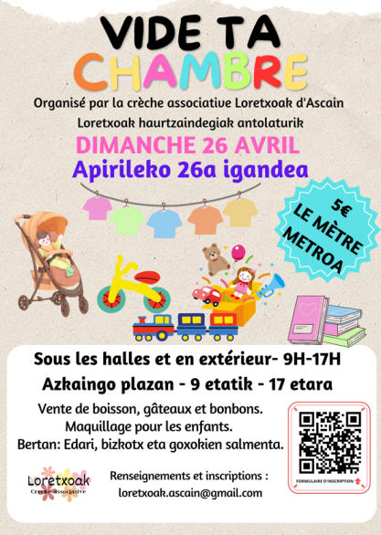 Azkaingo Loretxoak haurtzaindegiak "Vide ta chambre" ekimena antolatzen du 2026eko apirilaren 26an igandearekin, plazan eta merkatu estaldian, goizeko 9etatik arratsaldeko 5ak arte.